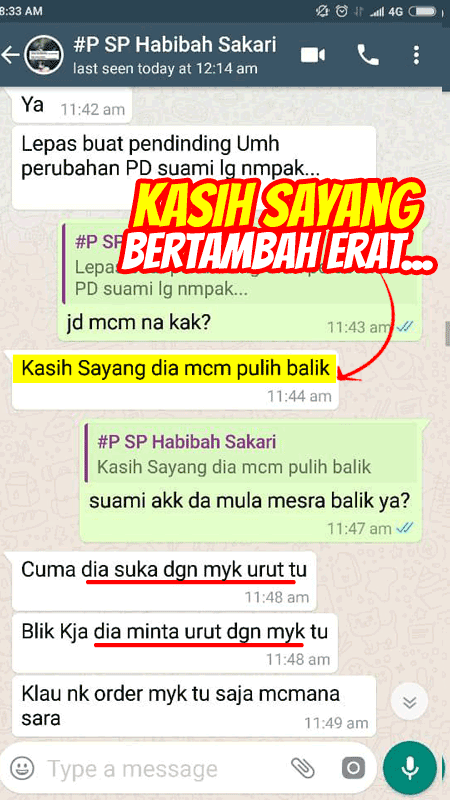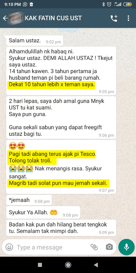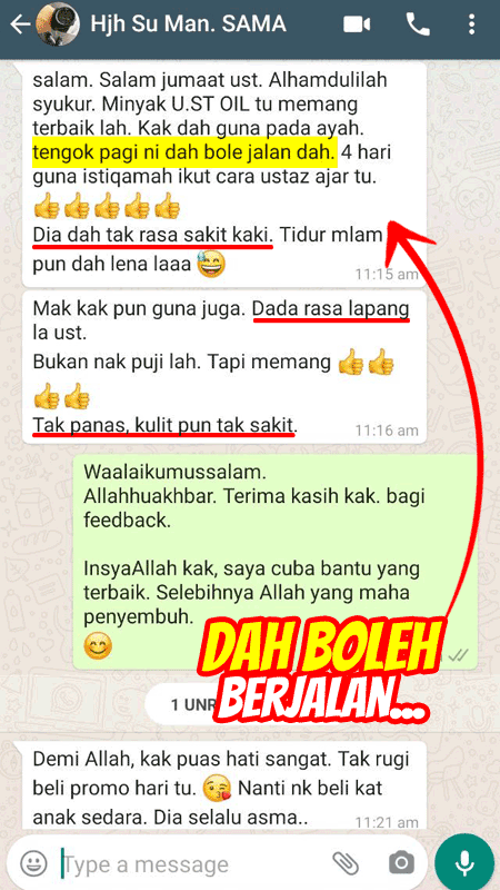Ustaz serius ni, ustaz tak main-main.. akak guna jer minyak UST dalam masa 3 bulan dan penggunaan 3 botol keatasย mengikut kaedah yg diberi. Andai tak berkesan langsung, ustaz bagi balik duit akak.. siap ustaz bagi 100% balik pada akak2.